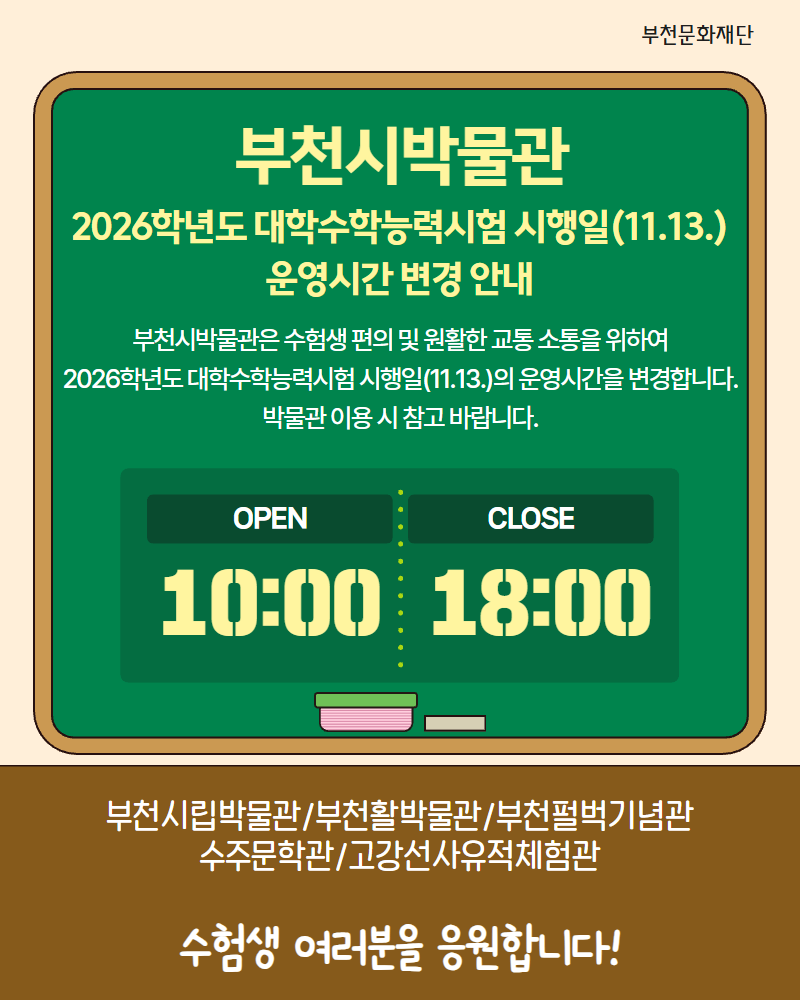 - 부천시박물관 2026학년도 대학수학능력시험 시행일(11.13.) 운영시간 변경 안내 2025.11.12