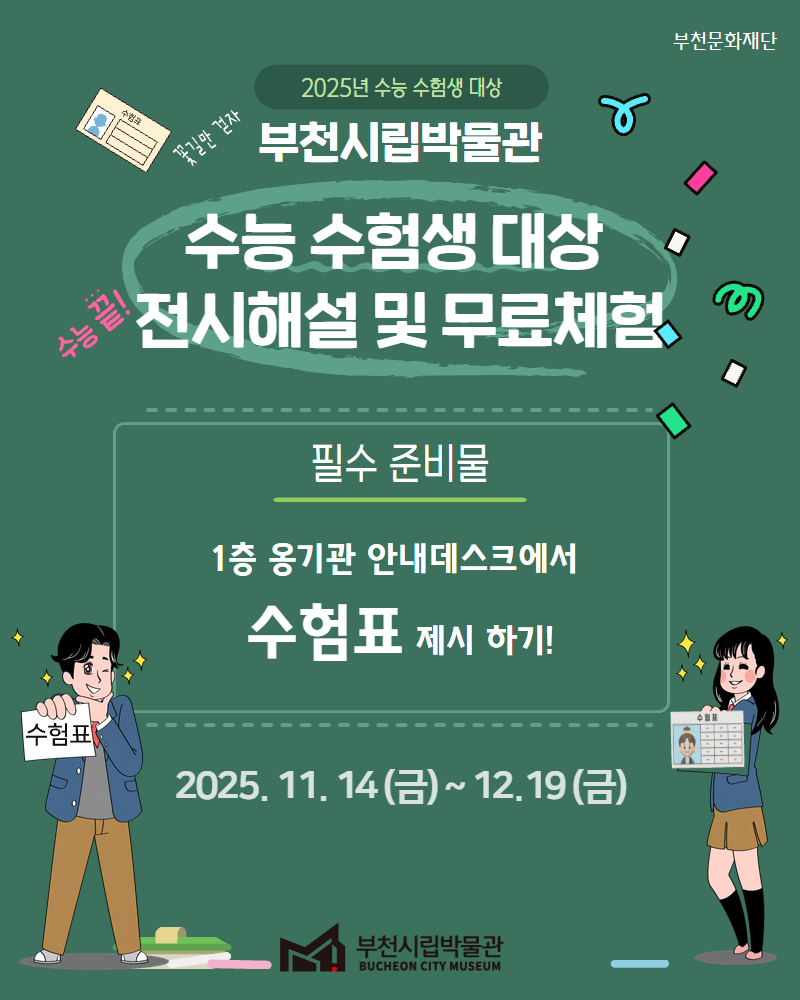 부천시립박물관은 2026학년도 대학수학능력시험을 마친 수험생들을 위해 특별 전시 해설과 무료 체험을 진행합니다.