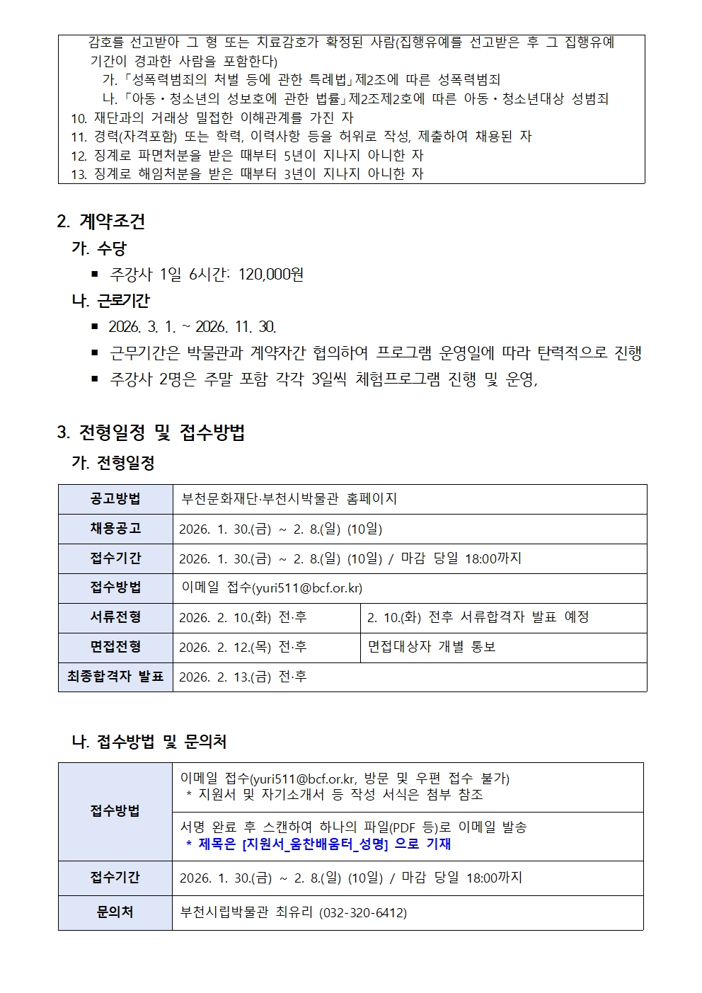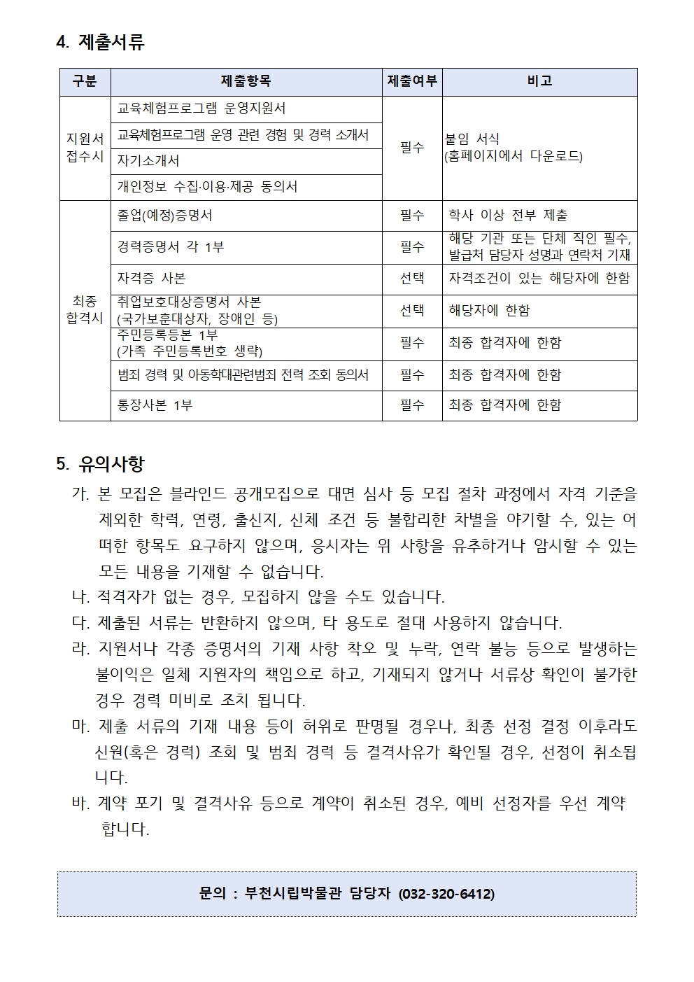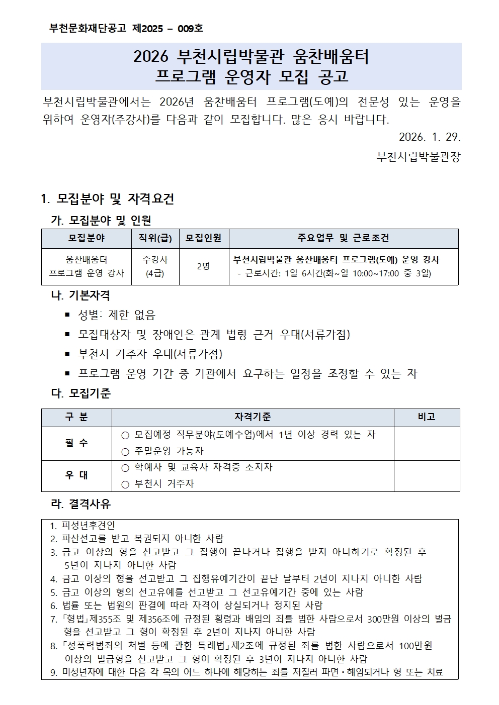 [공고 제2026–009호] 2026 부천시립박물관 움찬배움터 프로그램 운영자 모집 공고